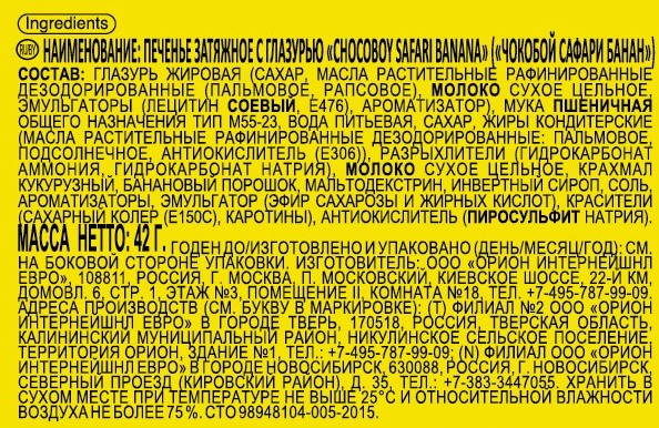 Глазурь жировая с добавлениями сахар, масло пальмовое рафинированное, дезодорированное, молоко сухое цельное, масло рапсовое рафинированное, эмульгаторы Е322, Е476, ароматизатор, мука пшеничная высший сорт, вода питьевая, сахар, жир кондитерский рафинированные дезодорированные растительные масла: пальмовое, подсолнечное, соевое; антиокислитель концентрат смеси токоферолов, эмульгатор лецитин соевый, разрыхлители гидрокарбонат аммония, гидрокарбонат натрия, крахмал кукурузный, молоко сухое цельное, банановый порошок, инвертный сироп, соль, мальтодекстрин, ароматизаторы, эмульгатор эфир сахарозы и жирных кислот, красители сахарный колер Е150с, каротины, антиокислитель пиросульфит натрия.