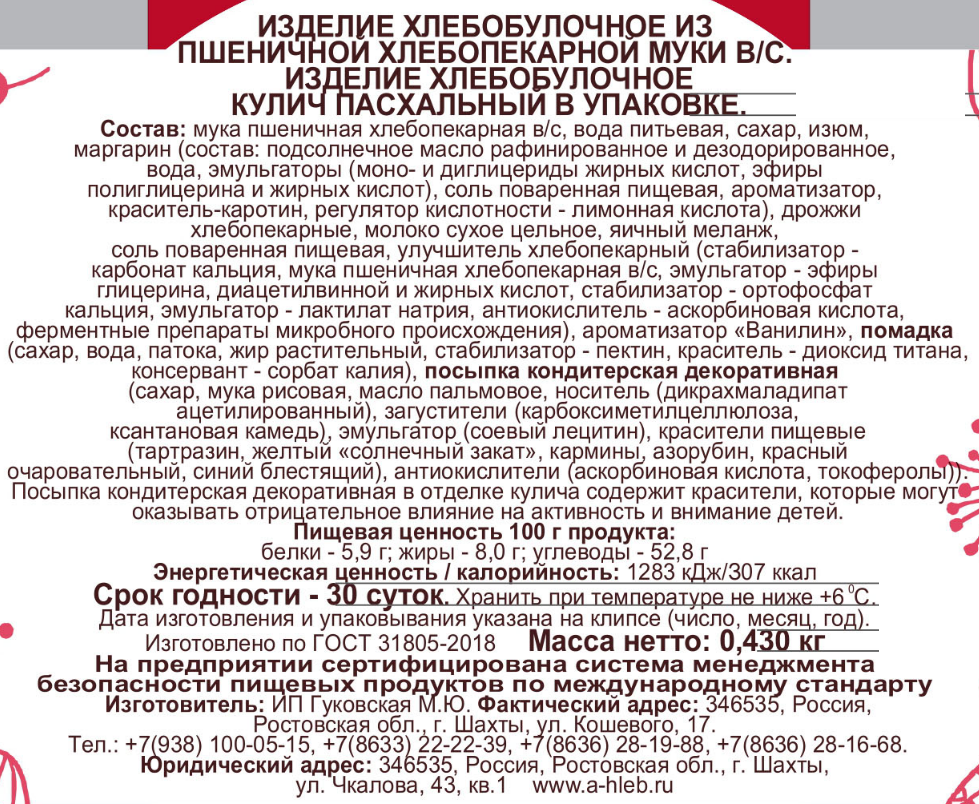 Мука пшеничная хлебопекарная в/с, вода питьевая, сахар, изюм, маргарин (подсолнечное масло рафинированное и дезодорированное, вода, эмульгаторы (моно- и диглицериды жирных кислот, эфиры полиглицерина и жирных кислот), соль поваренная пищевая, ароматизатор, краситель - каротин, регулятор кислотности - лимонная кислота), дрожжи хлебопекарные, молоко сухое цельное, яичный меланж, соль поваренная пищевая, улучшитель хлебопекарный (стабилизатор - карбонат кальция, мука пшеничная хлебопекарная в/с, эмульгатор - эфиры глицерина диацетилвинной и жирных кислот, стабилизатор - ортофосфат кальция, эмульгатор - лактилат натрия, антиокислитель - аскорбиновая кислота, ферментные препараты микробного происхождения), ароматизатор Ванилин, помадка (сахар, вода, патока, жир растительный, стабилизатор - пектин, краситель - диоксид титана, консервант - сорбат калия), посыпка кондитерская декоративная (сахар, мука рисовая, масло пальмовое, носитель (дикрахмаладипат ацетилированный), загустители (карбоксиметилцеллюлоза, ксантановая камедь), эмульгатор (соевый лецитин), красители пищевые (тартразин, желтый солнечный закат, кармины, азорубин, красный очаровательный, синий блестящий), антиокислители (аскорбиновая кислота, токоферолы)).