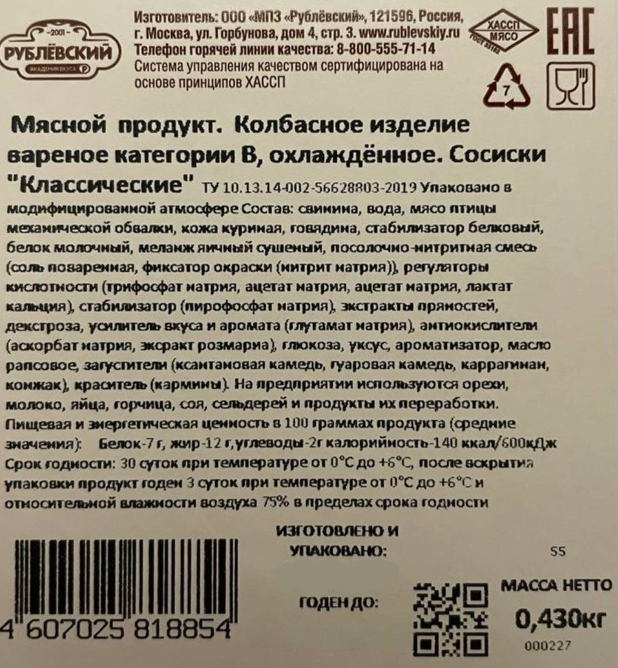 Свинина, вода, мясо птицы механической обвалки, кожа куриная, говядина, стабилизатор белковый, белок молочный, меланж яичный сушеный, посолочно-нитритная смесь (соль поваренная, фиксатор окраски (нитрит натрия)), регуляторы кислотности (трифосфат натрия, ацетат натрия, ацетат матрия, лактат кальция), стабилизатор (пирофосфат натрия), экстракты пряностей, декстроза, усилитель вкуса и аромата (глутамат натрия), антиокислители (аскорбат натрия, экстракт розмарина), глюкоза, уксус, ароматизатор, масло рапсовое, загустители (ксантановая камедь, гуаровая камедь, каррагинан, конжак), краситель (кармины). На предприятии используются орехи, молоко, яйца, горчица, соя, сельдерей и продукты их переработки.