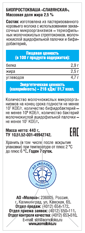 Пастеризованное коровье молоко с использованием заквасочных микроорганизмов - термофильных молочнокислых стрептококков, молочнокислой ацидофильной палочки и бифидобактерии.