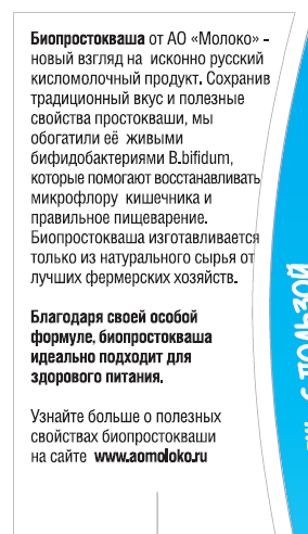 Биопростокваша "О био" - это уникальный кисломолочный продукт, сочетающий целебные и питательные свойства, производимый из цельного молока и обогащенный живыми бифидобактериями. Она содержит живую бифидо- и лактофлору, комплекс ферментов, витаминов, и биологически активных веществ, жизненно необходимых организму, оказывает благоприятное действие на организм человека, способствуют формированию правильной микрофлоры, повышает иммунитет и и восстанавливает естественный балланс. Легкий, нежный, освежающий вкус Биопростокваши позволит Вам заботиться о своем здоровье с удовольствием.