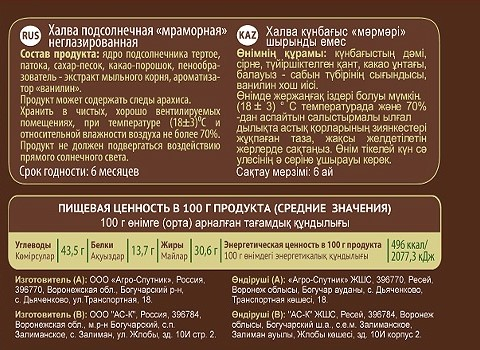 Ядро подсолнечника тертое, патока, сахар-песок, какао-порошок, пенообразователь-экстракт мыльного корня, ароматизатор ванилин.