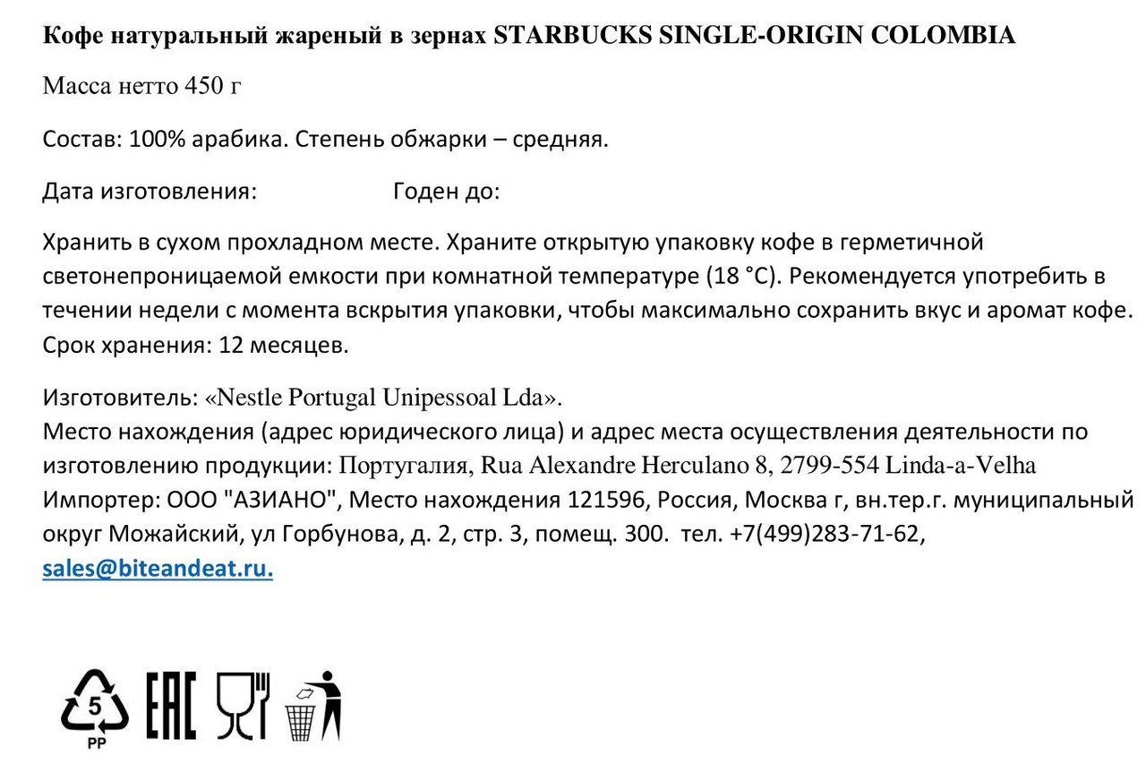 Кофе Starbucks Single-Origin Colombia зерновой, 450г