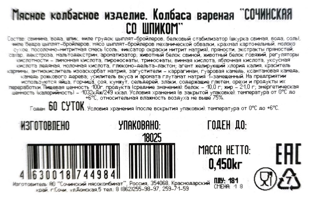 Сочинская со шпиком - традиционная вареная колбаса с характерной структурой на срезе. Изготавливается из говядины, куриной грудки, свинины со шпиком и натуральных специй с преобладанием черного перца, мускатного ореха и кардамона. Все это придает колбасе нежный оригинальный вкус. Благодаря натуральной оболочке продукт обладает тонким ароматом копчения. Сочинская со шпиком отлично подойдет для приготовления сытных бутербродов к семейному столу.