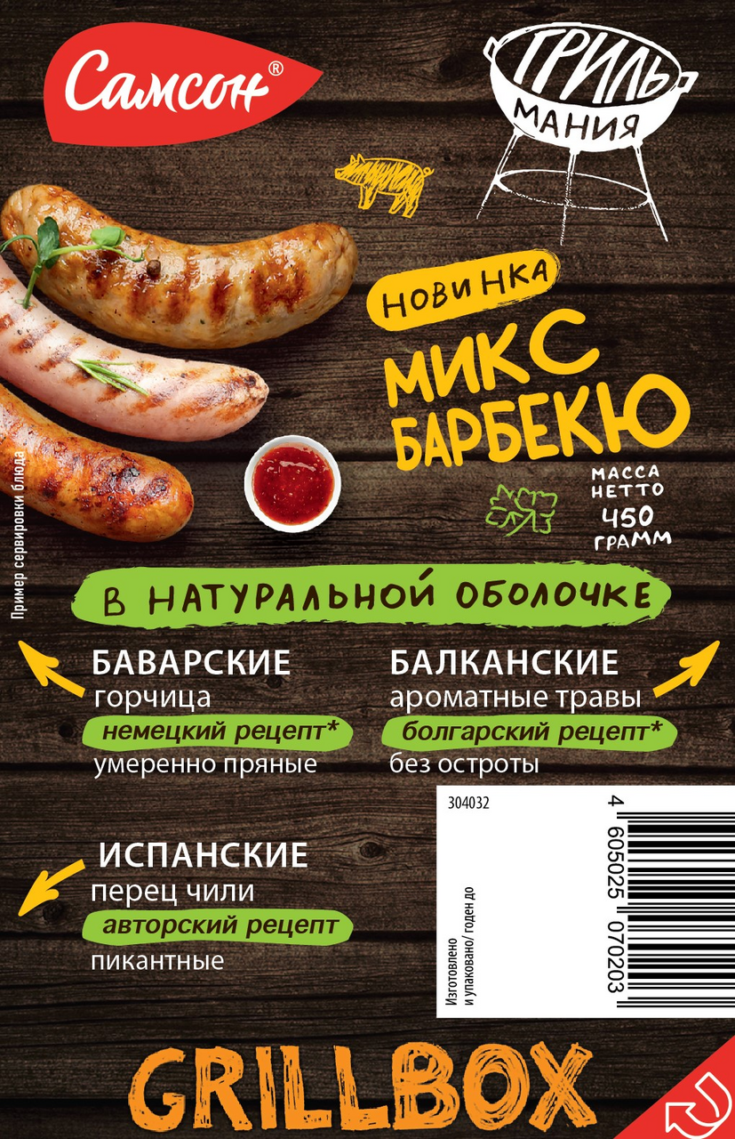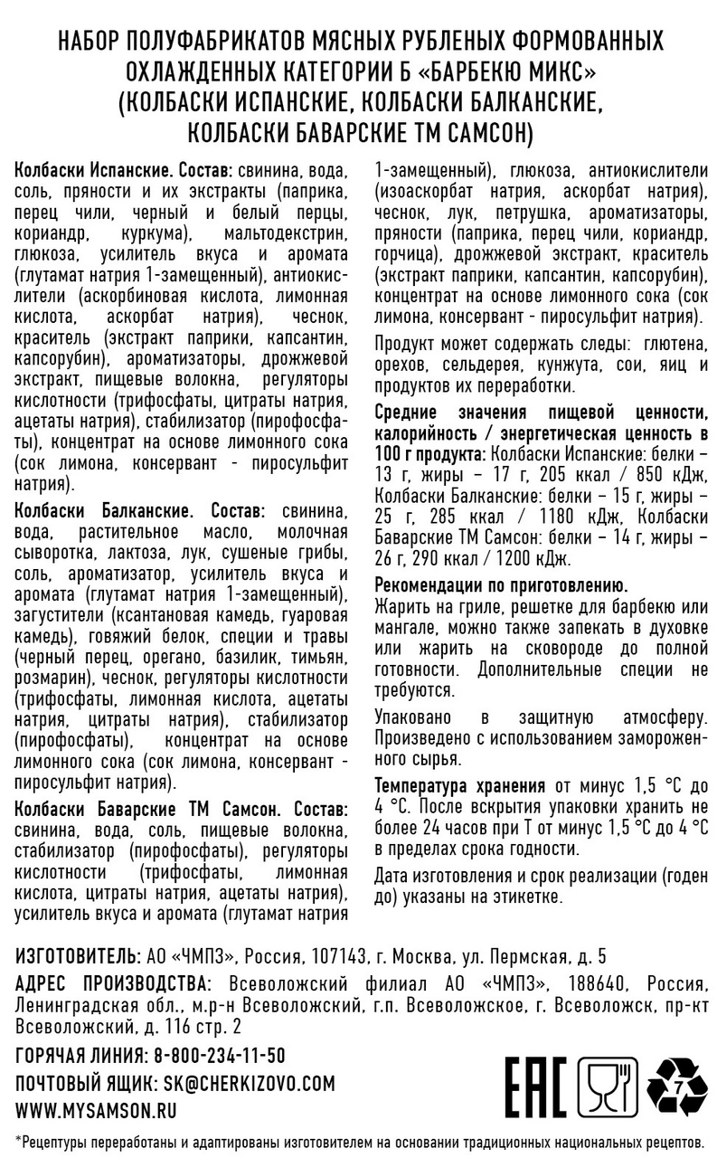 Набор полуфабрикатов мясных рубленых формованных категории Б охлажденных. Барбекю Микс (Колбаски Испанские, Колбаски Балканские, Колбаски Баварские ТМ Самсон). Аппетитные мясные колбаски из отборного свежего фарша с натуральными специями, которые подчеркивают вкус мяса. Готовить колбаски можно на сковороде или углях. Особенно вкусно блюдо получается на гриле. Отличный вариант для приготовления вкусного ужина на природе.