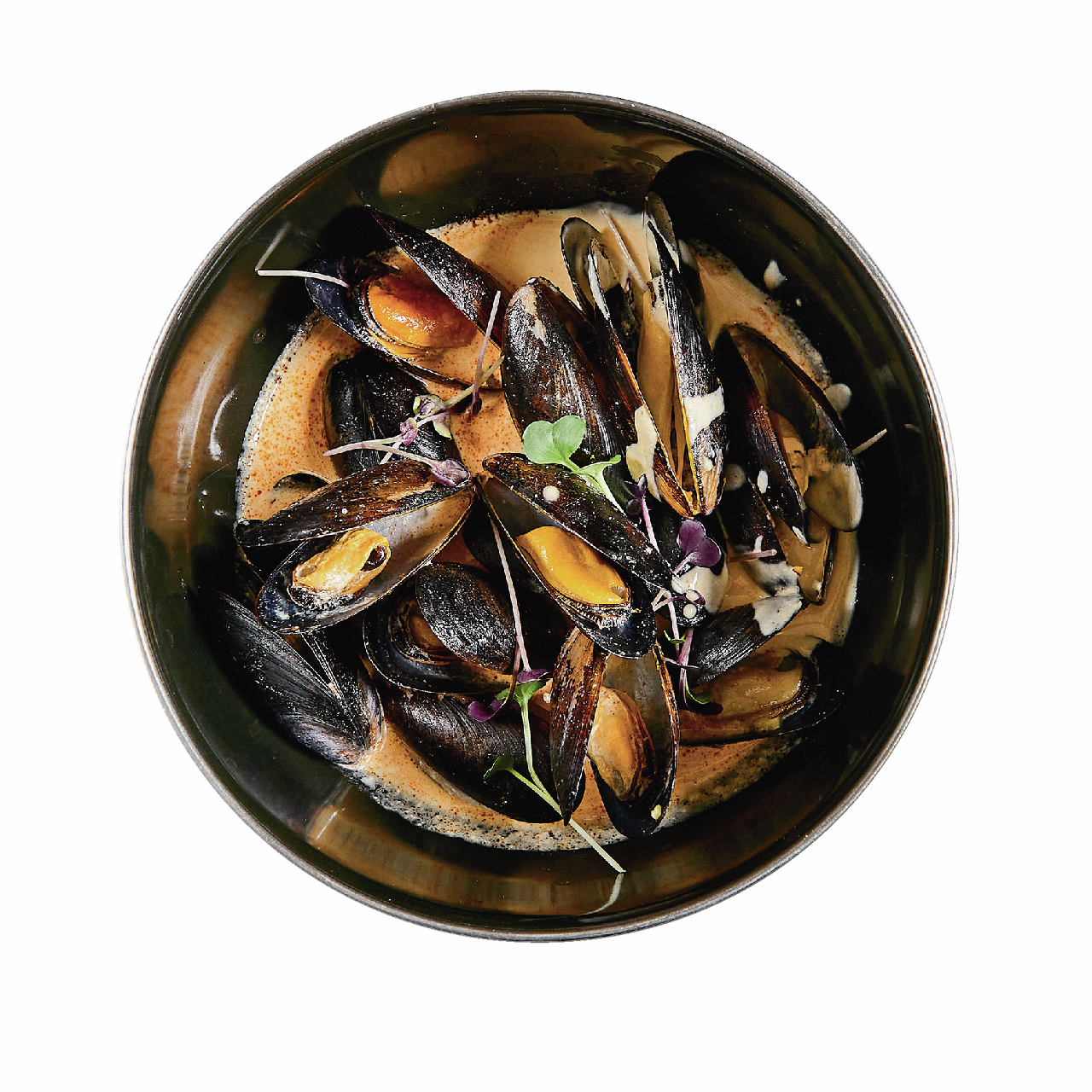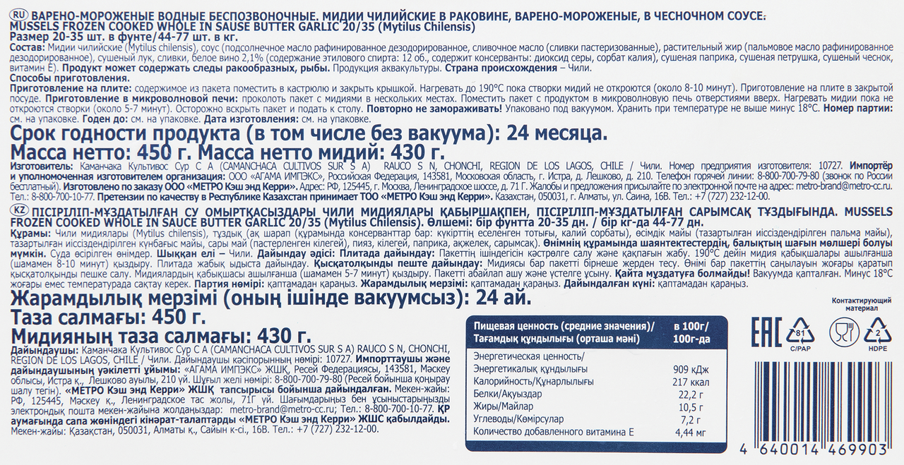 Мидии чилийские, соус (подсолнечное масло рафинированное дезодорированное, сливочное масло (сливки пастеризованные), растительный жир (пальмовое масло рафинированное дезодорированное), сушеный лук, сливки, белое вино 2,1% (содержание этилового спирта 12 об., содержит консерванты: диоксид серы, сорбат калия), сушеная паприка, сушеная петрушка, сушеный чеснок, витамин Е). Продукт может содержать следы ракообразных, рыбы.