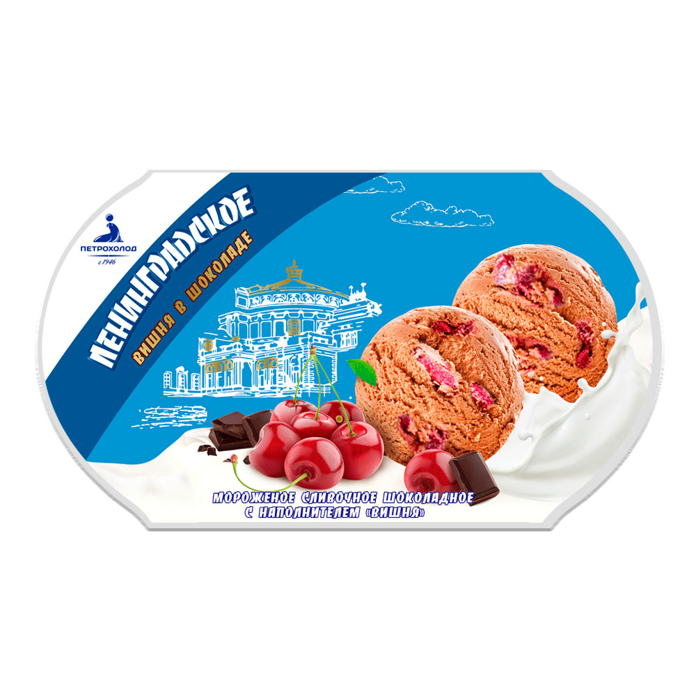 Мороженое Ленинградское шоколадное с наполнителем Вишня. Оно освежает и тонизирует, утоляет голод, восстанавливает силы и поднимает настроение.