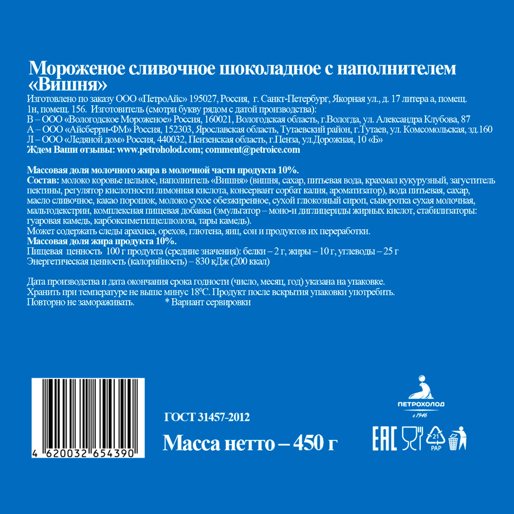 Мороженое сливочное Ленинградское Шоколадное с вишней ГОСТ, 450г