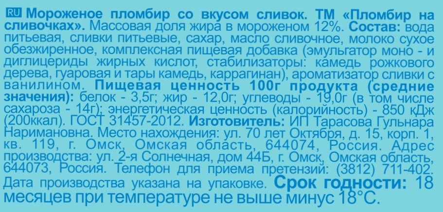 Вода, сливки питьевые, сахар, масло сливочное, молоко сухое обезжиренное, комплексная пищевая добавка (эмульгатор моно- и диглицериды жирных кислот, стабилизаторы (камедь рожкового дерева, гуаровая и тары камедь, каррагинан), ароматизатор сливки с ванилином.