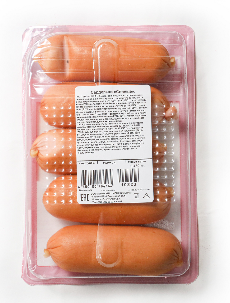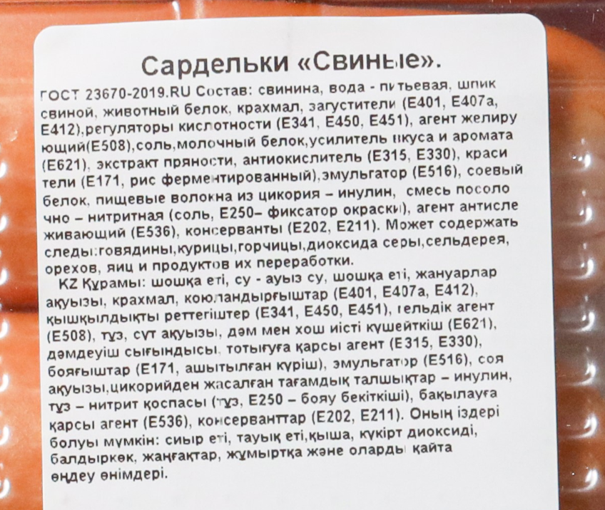 Свинина, свиные (мясо голов, шкурка, шпик), вода, мясо птицы механической обвалки, крахмал, смесь посолочно - нитритная (соль, Е250 –фиксатор окраски), агент антислеживающий (Е536), регуляторы кислотности (Е270, Е331, Е334, Е341iii, Е450, Е450iii, Е451), декстроза, соль, пряности (перец чёрный, кориандр, мускатный орех, дрожжи, имбирь), усилитель вкуса и аромата (Е621), антиокислители (Е300, Е330), загустители (Е401, Е407а, Е412, Е415), эмульгатор (Е516), мальтодекстрин, животный белок, консервант (Е260), молочная сыворотка, масло рапсовое, стабилизатор (Е470), красители (Е120, Е171, экстракт монаскуса).