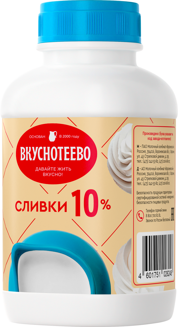 Сливки Вкуснотеево ультрапастеризованные ГОСТ 10%, 450г - высококачественный продукт, обладающий изысканным насыщенным вкусом и нежным ароматом. При производстве сливок используется бережный температурный режим, который сохраняет чистый вкус, свежесть, полезные свойства и питательную ценность продукта. Сливки необязательно хранить в холодильнике до открытия, поэтому их удобно взять с собой на работу, на дачу, на пикник. Их употребляют как самостоятельный напиток, для вкуснейшего кофе, а также для приготовления выпечки, супов или соусов.