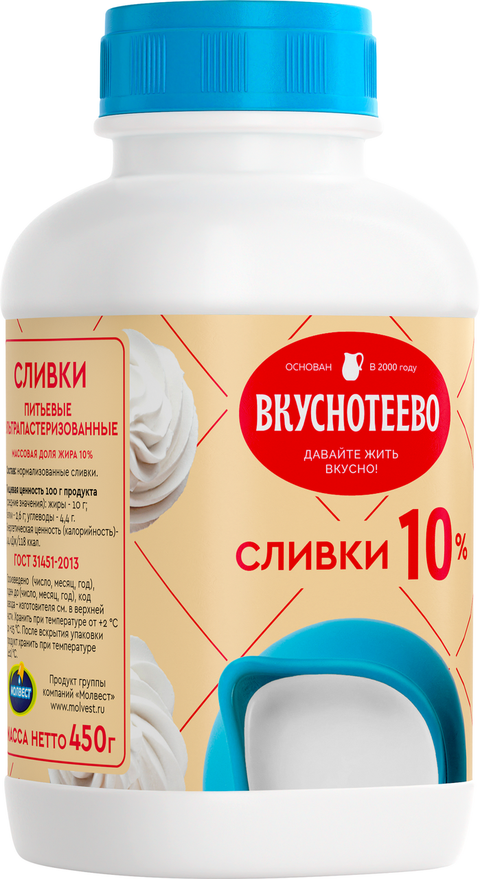 Сливки Вкуснотеево ультрапастеризованные ГОСТ 10%, 450г