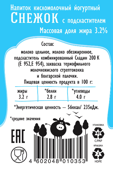 Молоко цельное, молоко обезжиренное, подсластитель комбинированный Сладин К200(Е952, Е954), закваска термофильного молочного стрептококка и болгарской плочки.