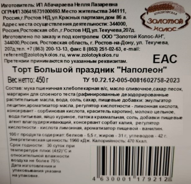 Торт Золотой колос Наполеон, 450г