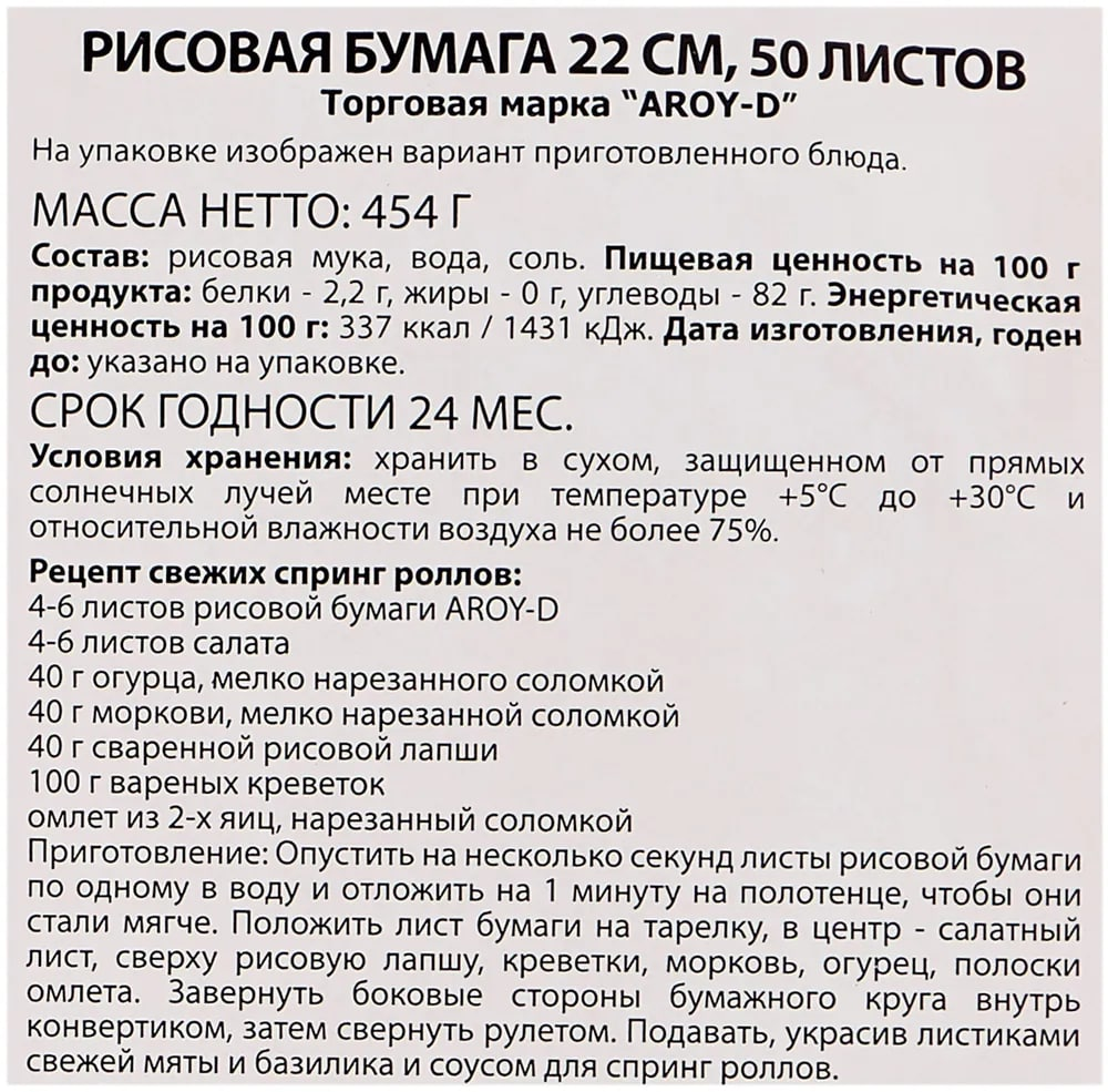 Это тонкие листы из сушеного рисового теста, сделанного из рисовой муки и воды. Широко используется в паназиатской кухне для изготовления блинчиков с разнообразной начинкой — свежих и жареных во фритюре. Тонкие и эластичные листы, изготовленные из высококачественной рисовой муки и воды с добавлением соли. В процессе использования бумага не рвется, что позволяет готовить по-настоящему вкусные и красивые азиатские блюда.