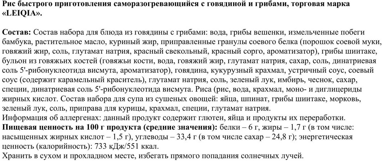 Набор для блюда из говядины с грибами: вода, грибы вешенки, измельченные побеги бамбука, растительное масло, куриный жир, приправленные гранулы соевого белка (порошок соевой муки, говяжий жир, соль, глутамат натрия, красный свекольный, красный сорго, ароматизатор), грибы шиитаке, бульон из говяжьих костей (говяжьи кости, вода, говяжий жир, глутамат натрия, сахар, соль, динатриевая соль 5’-рибонуклеотида висмута; рис: рис, вода, крахмал, моно- и диглицериды жирных кислот; Набор для супа из сушеных овощей: яйца, шпинат, грибы шиитаке, морковь, зеленый лук, соль, приправа для курицы, крахмал, специи, глутамат натрия.