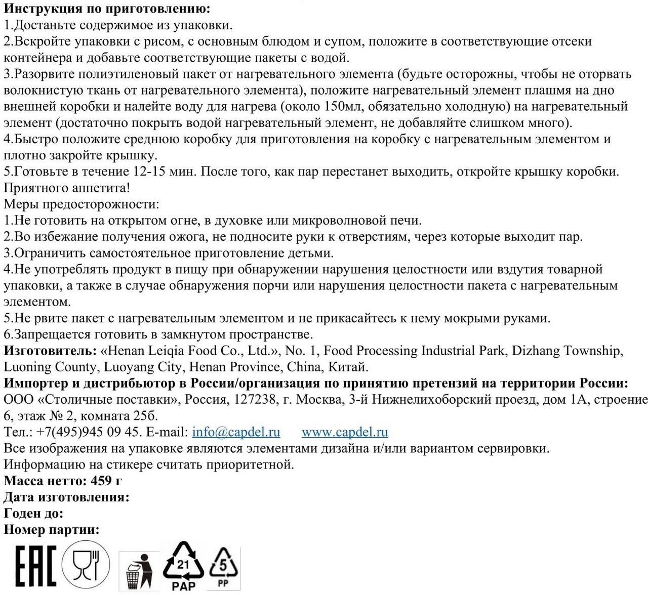 Саморазогревающаяся лапша и рис имеют в упаковке специальные нагревательные элементы, которые активируются если их залить обычной, даже холодной водой. Для разогрева достаточно нескольких минут и вот горячий обед готов. Продукт идеально подойдет для тех кто в движении, кто в походе, кто занят делами, кто экономит время или просто не хочет или не умеет готовить. С этими продуктами у вас всегда под рукой вкусный и самое главное горячий домашний обед. Традиционные китайские блюда с хорошим составом будут востребованы покупателями, имеющих ограниченное время на домашний быт, но также дачников, любителей походов и просто ценителей настоящей азиатской и китайской кухни.