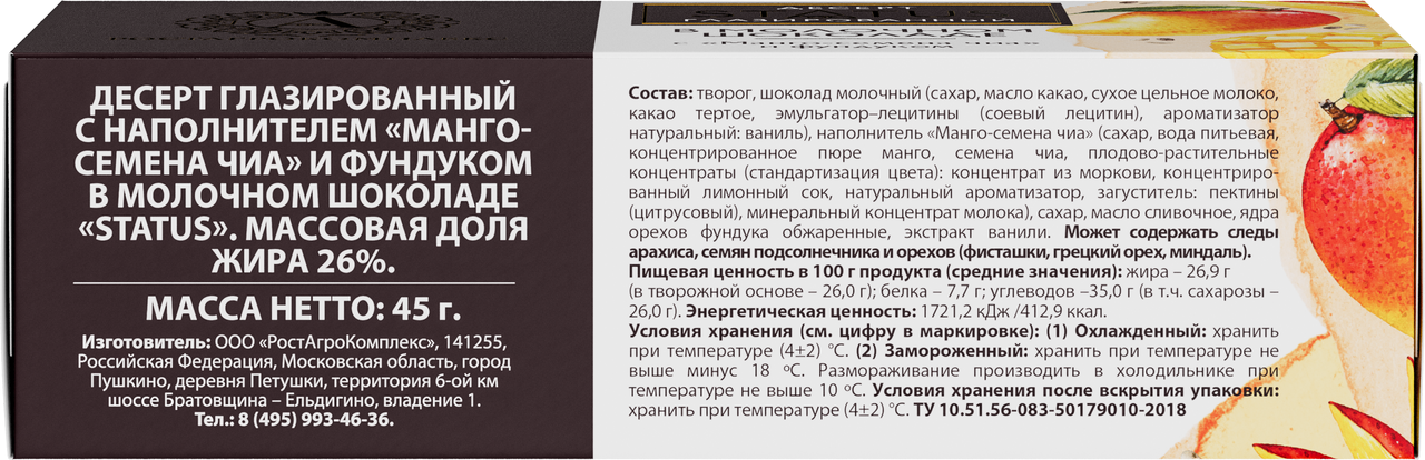 Десерт творожный глазированный А.Ростагрокомплекс с манго, семенами чиа и фундуком в молочном шоколаде 26%, 45г