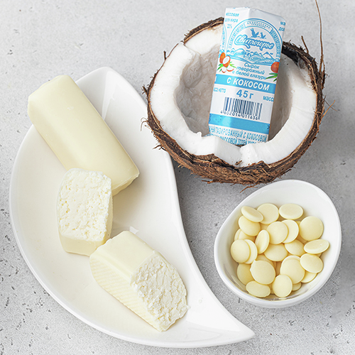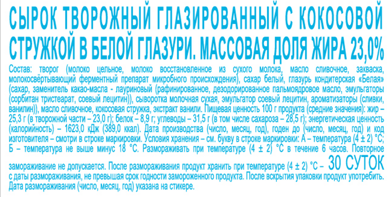 Творог молоко цельное, молоко восстановленное из сухого молока, масло сливочное, закваска, молокосвёртывающий ферментный препарат, сахар, глазурь кондитерская Белая сахар, заменитель какао-масла лауринового типа рафинированное, дезодорированное пальмоядровое масло, эмульгаторы сорбитан тристеарат, соевый лецитин, сыворотка молочная сухая, эмульгатор – соевый лецитин, ароматизаторы, сливочное масло, кокосовая стружка, экстракт ванили натуральный.