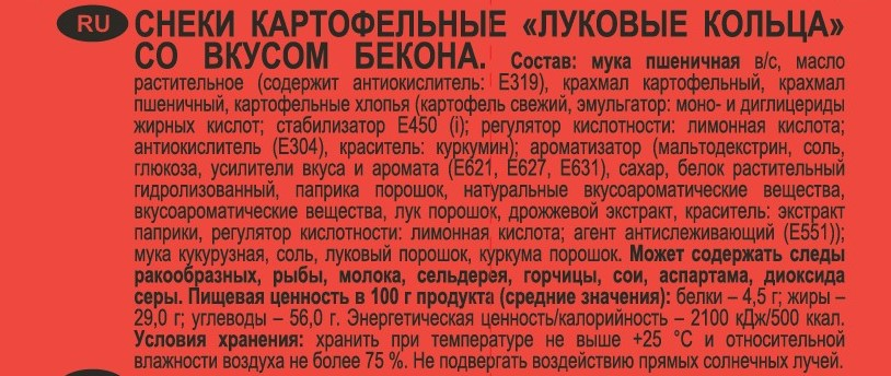 Мука пшеничная в/с, масло растительное (содержит антиокислитель: Е319), крахмал картофельный, крахмал пшеничный, картофельные хлопья (картофель свежий, эмульгатор: моно- и диглицериды жирных кислот; стабилизатор Е450 (i); регулятор кислотности: лимонная кислота; антиокислитель (Е304), краситель: куркумин); ароматизатор (мальтодекстрин, соль, глюкоза, усилители вкуса и аромата (Е621, Е627, Е631), сахар, паприка порошок, натуральные вкусоароматические вещества, вкусоароматические вещества, дрожжевой экстракт, лук порошок, регулятор кислотности: лимонная кислота; краситель экстракт паприки), мука кукурузная, соль, луковый порошок, куркума порошок. Может содержать следы ракообразных, рыбы, молока, сельдерея, горчицы, сои, аспартама, диоксида серы.