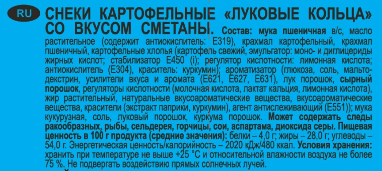 Мука пшеничная в/с, масло растительное содержит антиокислитель: Е319, крахмал картофельный, крахмал пшеничный, картофельные хлопья картофель свежий, эмульгатор: моно- и диглицериды жирных кислот; стабилизатор Е450 i; регулятор кислотности: лимонная кислота; антиокислитель Е304, краситель: куркумин; ароматизатор соль, глюкоза, мальтодекстрин, усилители вкуса и аромата Е621, Е627, Е631, лук порошок, сырный порошок, натуральные вкусоароматические вещества, вкусоароматические вещества, регулятор кислотности: лимонная кислота, красители куркумин, экстракт паприки, мука кукурузная, соль, луковый порошок, куркума порошок. Может содержать следы ракообразных, рыбы, сельдерея, горчицы, сои, аспартама, диоксида серы.