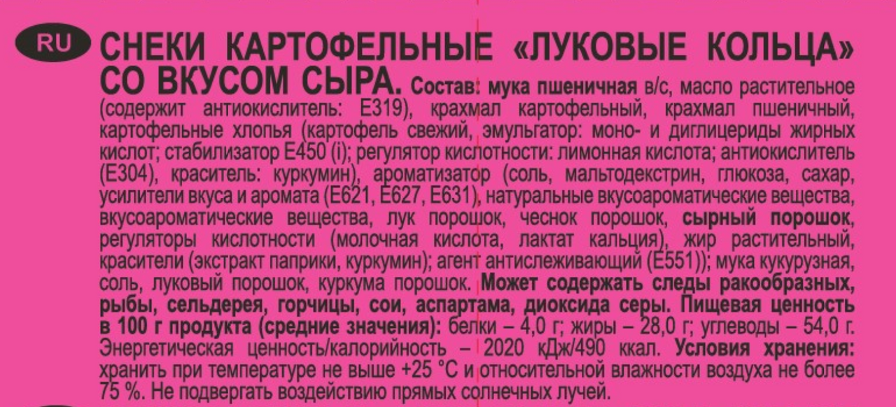 Мука пшеничная в/с, масло растительное содержит антиокислитель: Е319, крахмал картофельный, крахмал пшеничный, картофельные хлопья картофель свежий, эмульгатор: моно- и диглицериды жирных кислот; стабилизатор Е450i; регулятор кислотности: лимонная кислота; антиокислитель Е304i, краситель: куркумин, ароматизатор соль, мальтодекстрин, сахар, усилители вкуса и аромата Е621, Е627, Е631, вкусоароматические вещества, натуральные вкусоароматические вещества, сыр сухой нормализованное пастеризованное коровье молоко, молокосвертывающий фермент животного происхождения, закваска на основе молочнокислых бактерий, соль, уплотнитель хлорид кальция, мальтодекстрин, эмульгирующая соль Е339ii, лук порошок, чеснок порошок, регуляторы кислотности лимонная кислота, молочная кислота, лактат кальция, красители: куркумин, экстракт паприки; мука кукурузная, соль, луковый порошок, куркума порошок. Может содержать следы ракообразных, рыбы, сельдерея, горчицы, сои, аспартама, диоксида серы.
