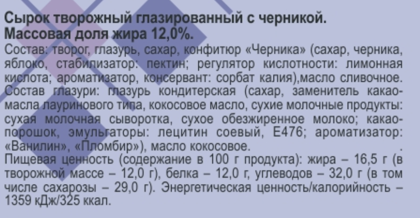 Творог, глазурь, сахар, конфитюр Черника (сахар, черника, яблоко, стабилизатор: пектин; регулятор кислотности: лимонная кислота, консервант: сорбат калия; краситель: паприка, кармин; ароматизатор), масло сливочное. Состав глазури: глазурь кондитерская (сахар, заменитель какао-масла лауринового типа, кокосовое масло, сухие молочные продукты: сухая молочная сыворотка, сухое обезжиренное молоко; какао-порошок, эмульгаторы: лецитин соевый, Е476; ароматизатор: Ванилин, Пломбир), масло кокосовое.