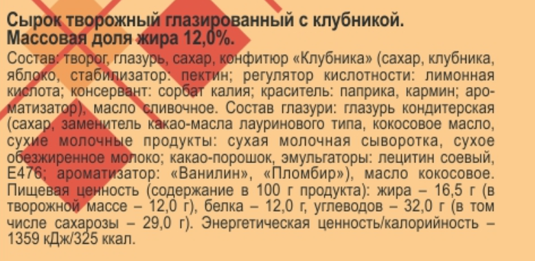 Творог, глазурь, сахар, конфитюр Клубника (сахар, клубника, яблоко, стабилизатор: пектин; регулятор кислотности: лимонная кислота, консервант: сорбат калия; краситель: паприка, кармин; ароматизатор), масло сливочное. Состав глазури: глазурь кондитерская (сахар, заменитель какао-масла лауринового типа, кокосовое масло, сухие молочные продукты: сухая молочная сыворотка, сухое обезжиренное молоко; какао-порошок, эмульгаторы: лецитин соевый, Е476; ароматизатор: Ванилин, Пломбир), масло кокосовое.