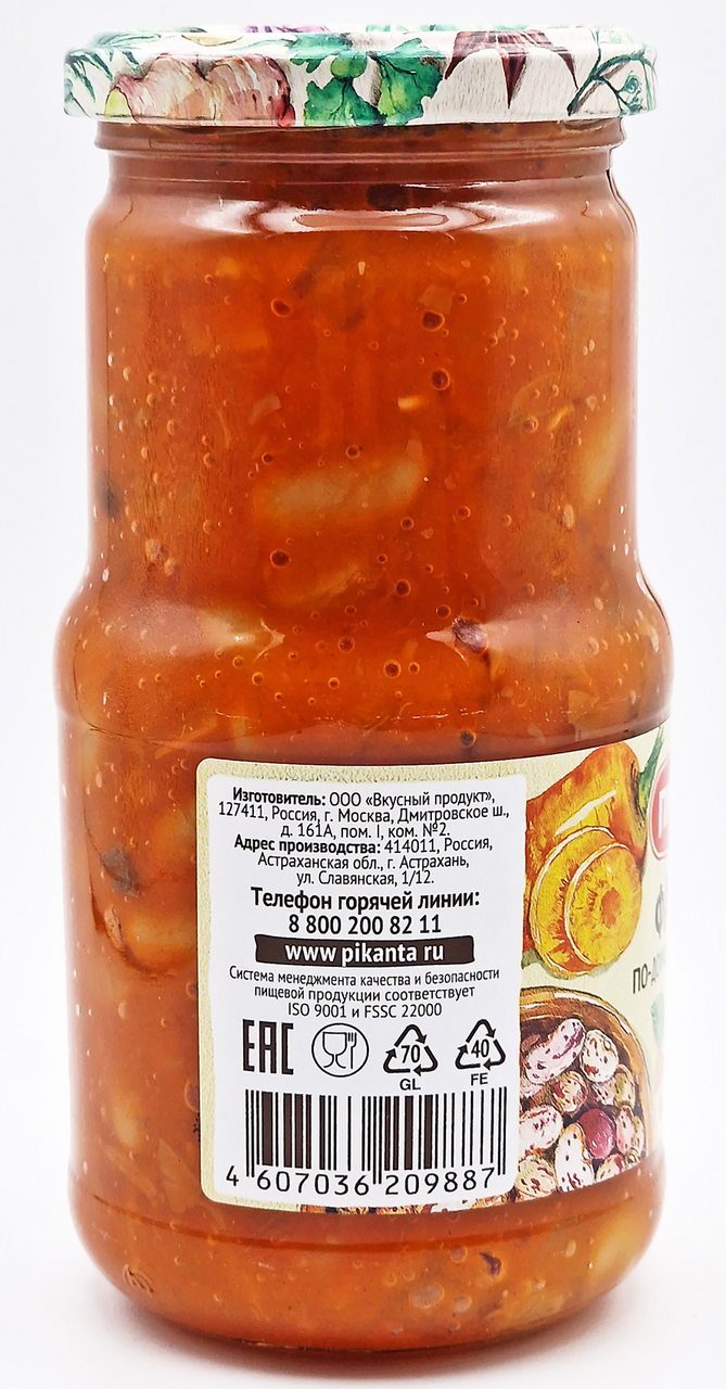 Фасоль, грибы шампиньоны, лук репчатый, морковь, паста томатная , перец сладкий, сахар, масло подсолнечное рафинированное дезодорированное, соль, загуститель крахмал кукурузный.