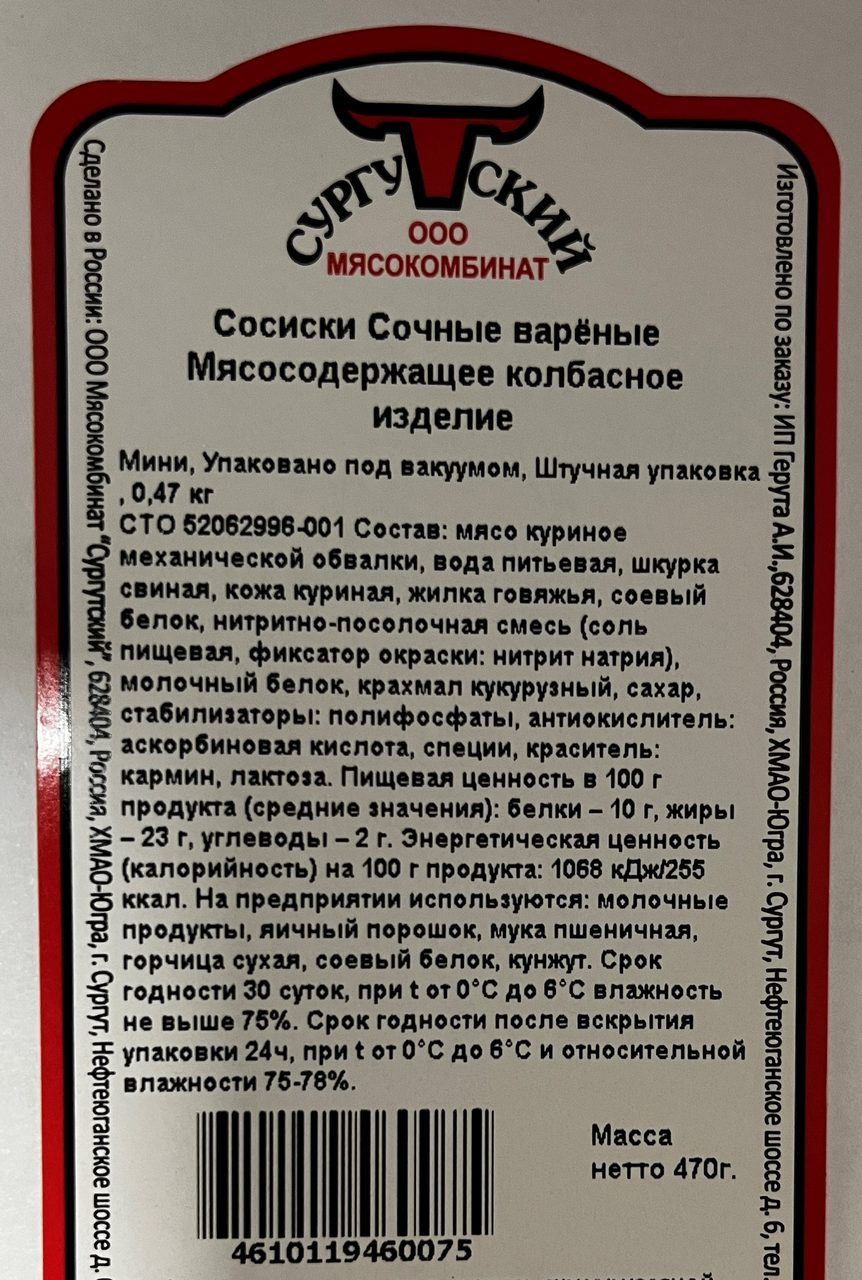 Мясо куриное механической обвалки, вода питьевая, шкурка свиная, кожа куриная, жилка говяжья, соевый белок, нитритно-посолочная смесь (соль пищевая, фиксатор окраски: нитрит натрия), молочный белок, крахмал кукурузный, сахар, стабилизаторы: полифосфаты, антиокислитель: аскорбиновая кислота, специи, краситель: кармин, лактоза.