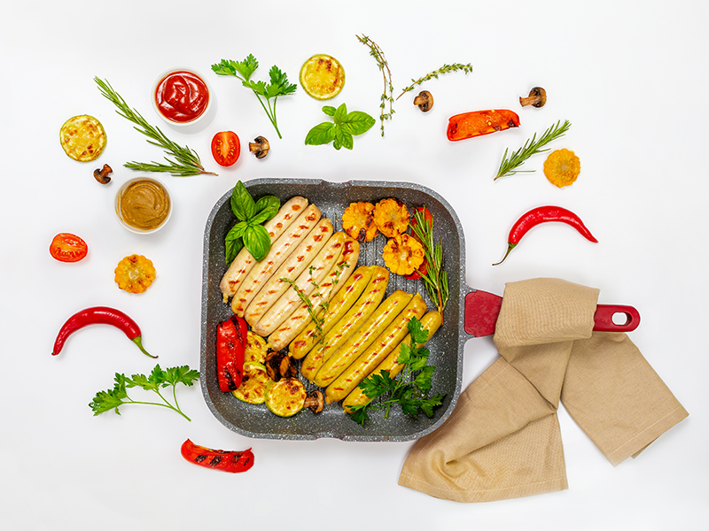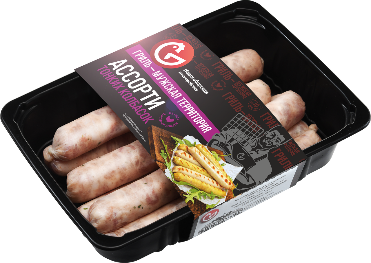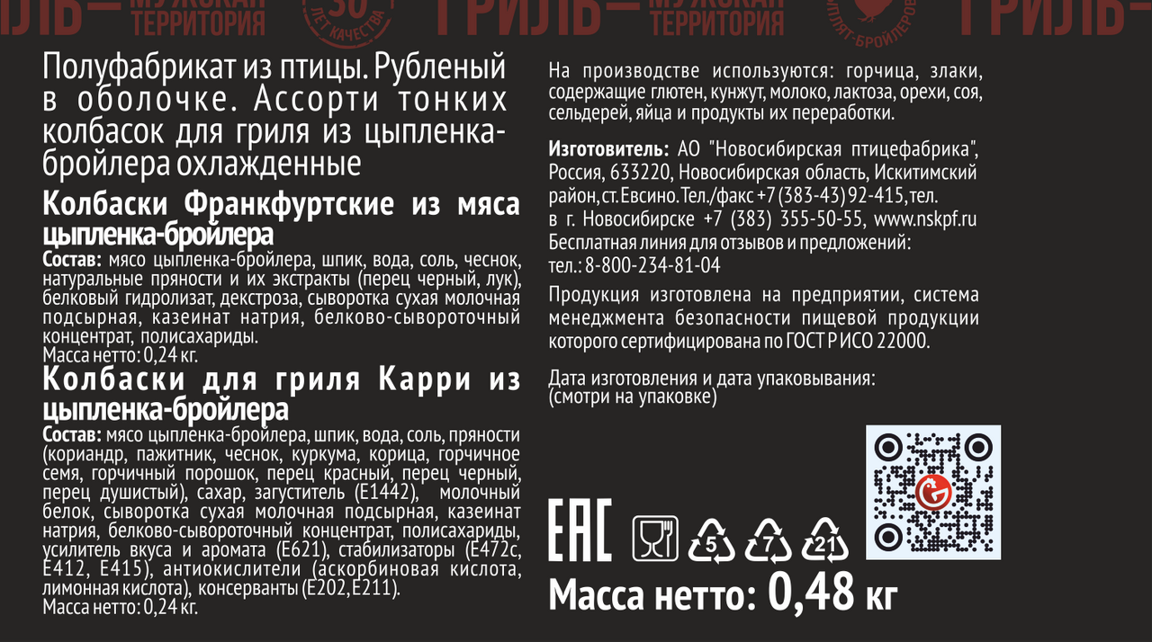 Рубленый в оболочке полуфабрикат из птицы. Ассорти колбасок для гриля из цыпленка-бройлера охлажденные. Ассорти тонких колбасок. В упаковке два продукта: колбаски Карри со смесью приправ перца, куркумы, кориандра и пажитника и колбаски Франкфуртские со шпиком и минимальным добавлением специй.