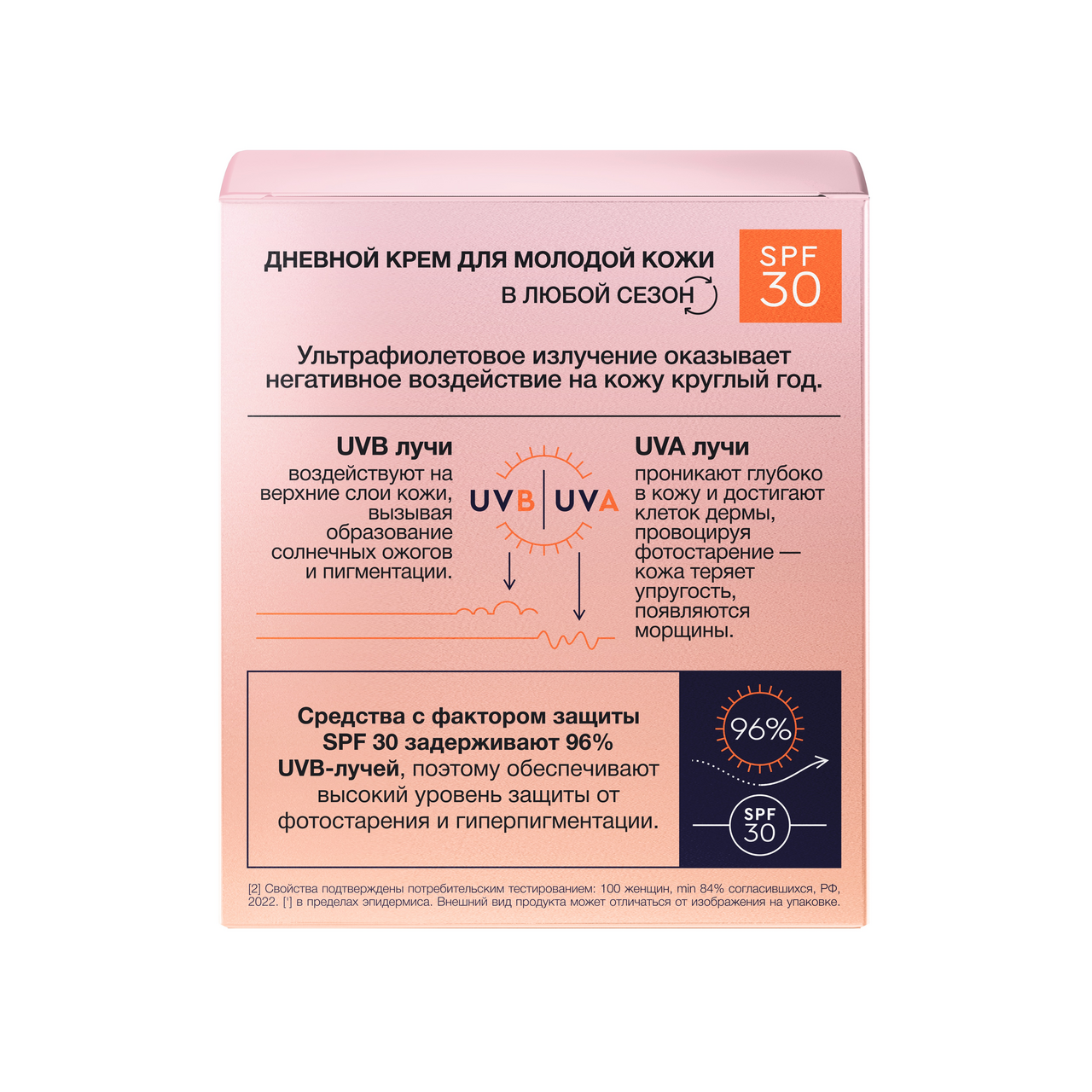 Разработан с учетом потребностей кожи в молодом возрасте. SPF 30 защищает от UV-излучения, препятствует преждевременному старению и гиперпигментации. Витамин С придает сияние и сокращает морщины. Антиоксидантный комплекс OxiFree увлажняет, стимулирует естественные барьерные функции кожи для защиты от неблагоприятного воздействия окружающей среды. Гиалуроновая кислота увлажняет, восстанавливает водный баланс кожи. Коллаген восстанавливает упругость кожи и повышает ее эластичность.