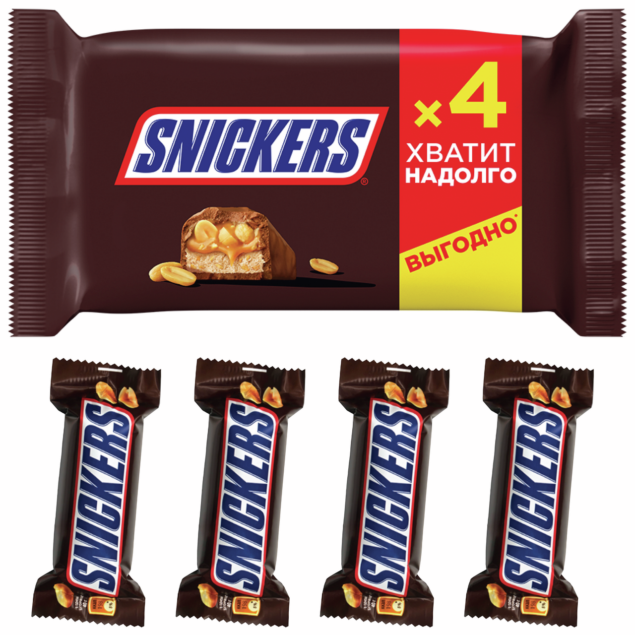 Упаковка шоколадных батончиков Snickers с жареным арахисом, нугой, карамелью и молочным шоколадом. Сладость, которую можно взять с собой в дорогу на любой случай, когда нужно вкусно зарядиться энергией. Поделитесь вкусом Snickers с друзьями, семьей или коллегами по работе. Идеален вместе с горячими напитками или под просмотр хорошего фильма. Не содержит красителей и консервантов 4 х 40г шоколадный батончик.