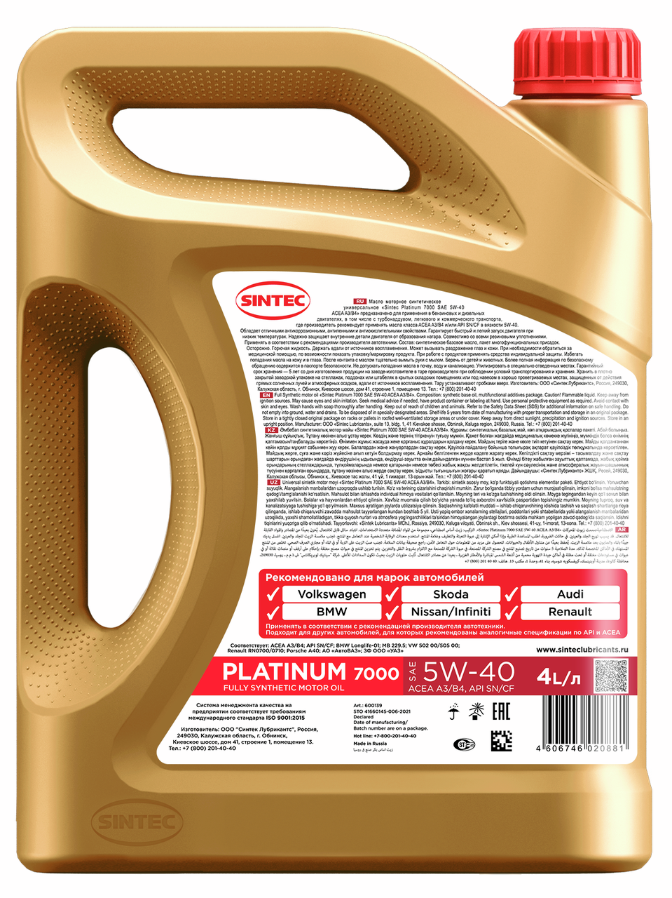 Производится из синтетических базовых масел и высокоэффективного многофункционального импортного пакета присадок от мирового лидера отрасли. Синтетические базовые масла обеспечивают отличные низкотемпературные и термоокислительные свойства, что обеспечивает лёгкий пуск в самых суровых погодных условиях и увеличенный интервал замены масла, даже при высоких нагрузках на ДВС. Противоизносные и моюще-диспергирующие присадки последнего поколения гарантируют непревзойдённую защиту и чистоту двигателя на весь срок службы масла.