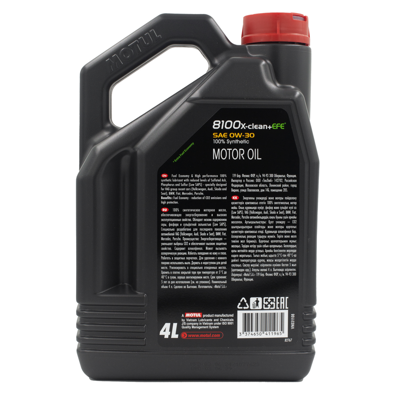 Масло моторное Motul 8100 X-Clean+ EFE 0W30, 4л - высокоэффективное 100% синтетическое масло, специально разработанное для дизельных и бензиновых двигателей последнего поколения, соответствующих нормам EURO IV, EURO V и EURO VI, для которых требуется моторное масло SAE 0W30 ACEA C3 с высокой вязкостью и Mid SAPS. Одобрено и рекомендовано моторное масло для автомобилей BMW, CHRYSLER, FIAT, MERCEDES, PORSCHE и VAG (VW, Audi, Seat, Skoda) последнего поколения благодаря свойствам EFE - Extra Fuel Economy. Стандарты ACEA C3 одобрения BMW LL-04 MERCEDES-BENZ MB-Approval 229.52 PORSCHE C30 VW 504 00 507 00. Соответствие требованиям FIAT 9.55535-S3, CHRYSLER MS 11106. Преимущества: - Имеет усовершенствованную синтетическую основу в сочетании со специальными модификаторами трения и уровнем сульфатной̆ зольности, фосфора и серы (SAPS), которые обеспечивают превосходную стойкость масляной̆ пленки, снижают трение в двигателе и обеспечивают совместимость с устройствами доочистки отработавших газов; - Обладает высокими смазывающими, противоизносными свойствами, и высокой̆ термостойкостью, что позволяет уменьшить расход масла на угар; - Обеспечивает увеличенные интервалы замены, контролируемые бортовым компьютером автомобиля; - Класс вязкости 0W-30 минимизирует гидродинамические потери на трение, обеспечивая энергосберегающие свойства, особенно при низкой̆ температуре масла; - Улучшает подачу масла при запуске, ускоряет повышение давления масла, ускоряет увеличение оборотов и достижение рабочей̆ температуры. Данное моторное масло снижает негативное воздействие на окружающую среду, позволяя снизить расход топлива и, следовательно, свести к минимуму выбросы парниковых газов (CO2).