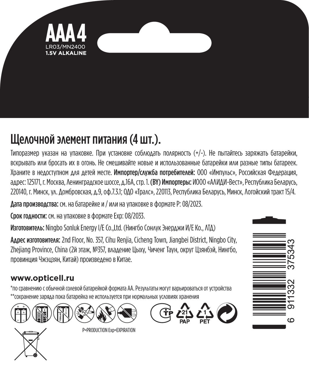 Батарейки базовой линейки Opticell размера AAA (мизинчиковые) работают намного дольше по сравнению с солевой батарейкой типа ААА. Результаты могут варьироваться в зависимости от устройства и интенсивности использования). Имеют защиту от протекания и не содержат тяжёлых металлов. До 10 лет сохраняют заряд при нормальных условиях хранения (пока батарейка не используется). Батарейки подойдут для бытовых приборов, техники или игрушек. Универсальные долговечные щелочные элементы питания обеспечивают длительный срок службы различных приборов и приспособлений в домашних и производственных условиях. Не предназначены для повторного заряда.