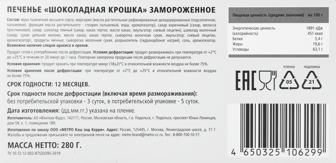 Мука пшеничная высшего сорта, маргарин (масла растительные рафинированные дезодорированные (подсолнечное, пальмовое), фракция масла растительного - стеарин пальмовый, вода, ароматизатор), сахар коричневый (сахар меласса тростниковая), сахар, шоколад темный (сахар, сухое цельное молоко, масло какао, какао тертое, сыворотка молочная сухая, эмульгатор: соевый лецитин, ароматизатор), продукты яичные, сыворотка молочная сухая, разрыхлитель (гидрокорбонат натрия), соль, ароматизатор.