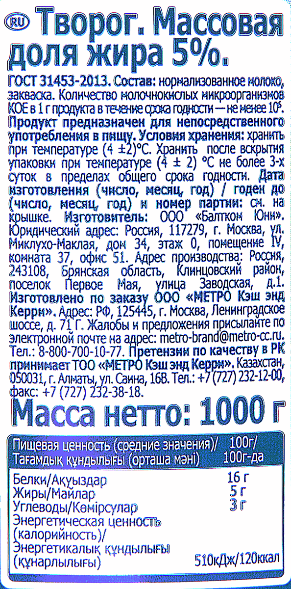 Творог 5% Metro Chef 1000 г – натуральный молочный продукт. Представленный творог характеризуется нежным и сливочным вкусом с легкой солоноватостью. Этот продукт – прекрасный и сбалансированный вариант для полезного завтрака. Его можно сочетать с любимыми фруктами, ягодами, орехами, джемом или топпингом. Также такой творог – удачная основа для нежных сырников и запеканки. Его можно применять в качестве начинки для блинчиков и выпечки. Творог – полезный продукт для здоровья взрослых и детей. В нем содержится большое количество витаминов, минералов, в частности, кальция и фосфора, а также легкоусвояемых белков.