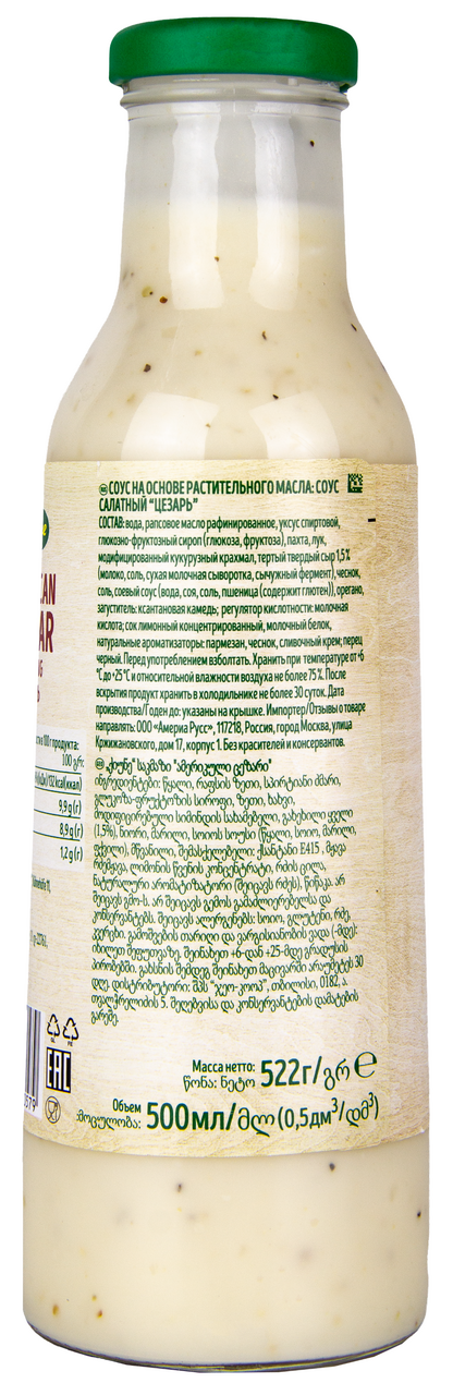Прекрасно дополнит собой салаты, вторые блюда и гарниры к ним. Нежный и вместе с тем пряный вкус продукта составит отличную пару с мясом птицы, овощами и пастой. Соус изготовлен по особенной рецептуре с применением передовых технологий. В его состав вошел сыр пармезан, натуральная пахта, лимонный сок, яичный желток, чеснок и соевый соус.
