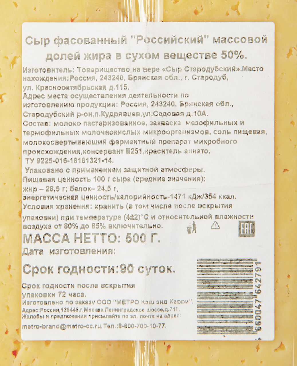 Metro Chef Сыр российский 50%, 500г БЗМЖ (без заменителя молочного жира) изготовлен с использованием заквасок мезофильных и термофильных молочнокислых организмов, молокосвертывающего фермента животного происхождения. Продукт обладает сбалансированным сладковатым вкусом с легкой кислинкой, прекрасно подходит в качестве закуски или ингредиента разных блюд. Сыр можно подать к белому вину, бутербродам, посыпать им пиццу, пасту или включить в начинку различных пирогов.