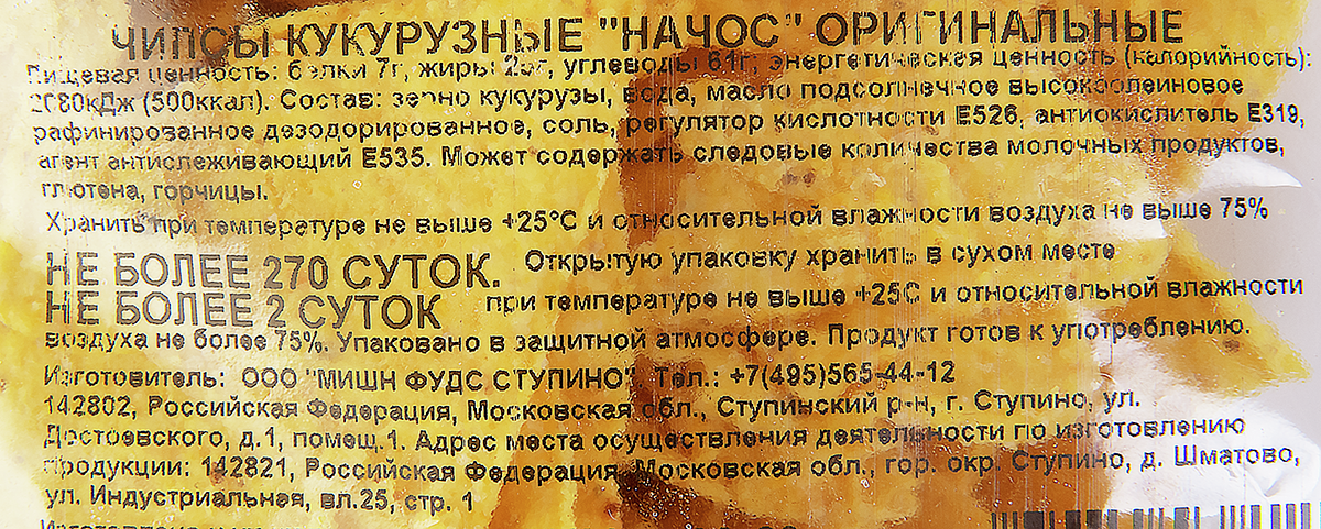 Зерно кукурузы, вода, масло подсолнечное высокоолеиновое рафинированное дезодорированное, соль, регулятор кислотности Е526, антиокислитель Е319, агент антислеживающий Е535.