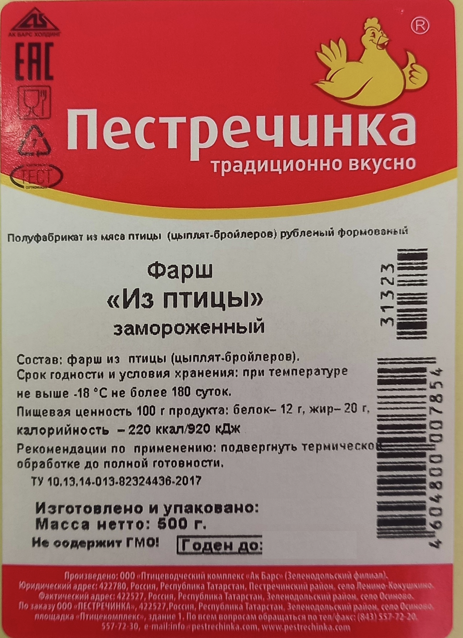 Фарш мясной из птицы Пестречинка замороженный, 500г