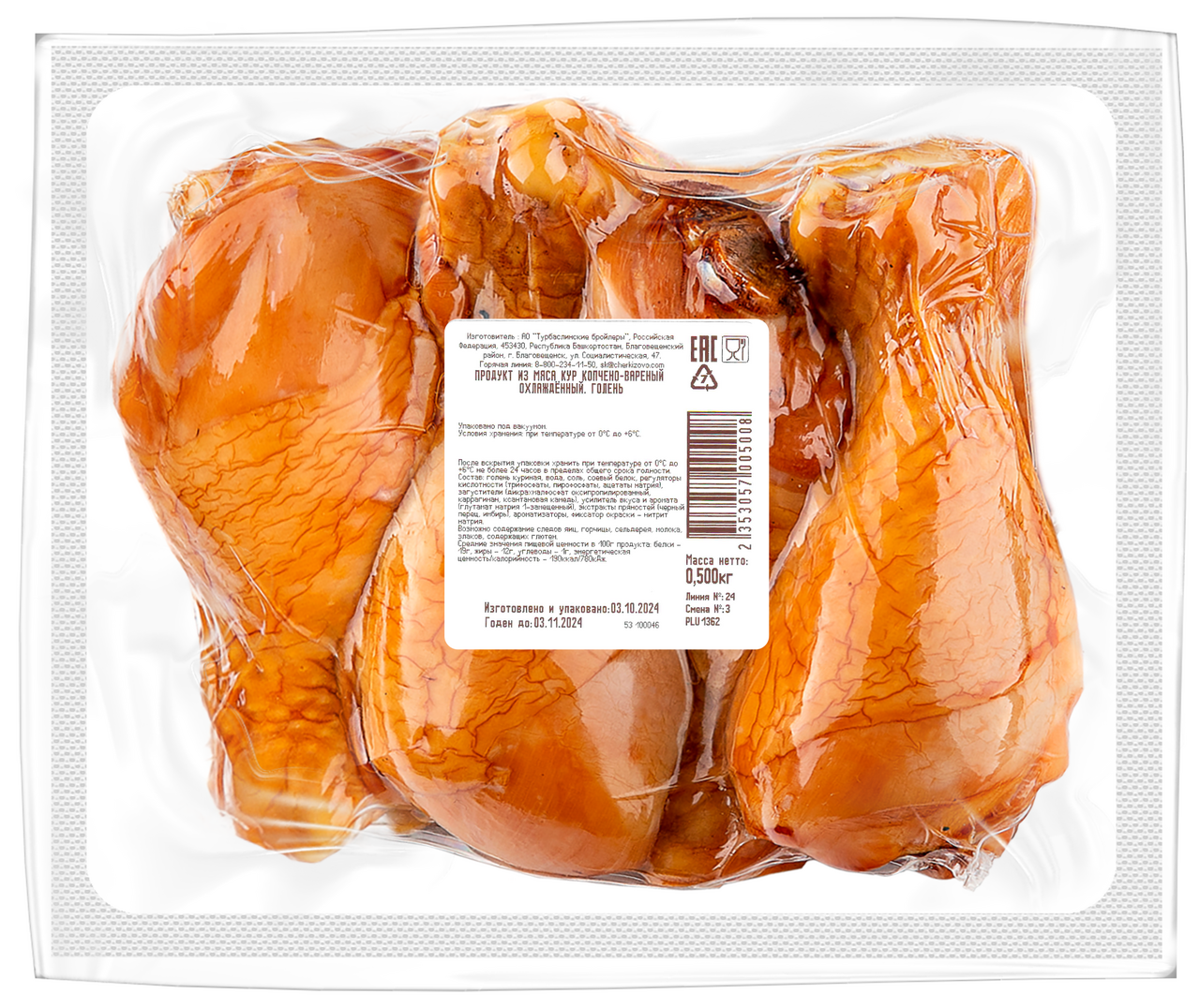 Голень куриная, вода, соль, соевый белок, регуляторы кислотности трифосфаты, пирофосфаты, ацетаты натрия, загустители дикрахмалфосфат оксипропилированный, каррагинан, ксантановая камедь, усилитель вкуса и аромата глутамат натрия 1-замещенный, экстракты пряностей черный перец, имбирь, ароматизаторы, фиксатор окраски - нитрит натрия.