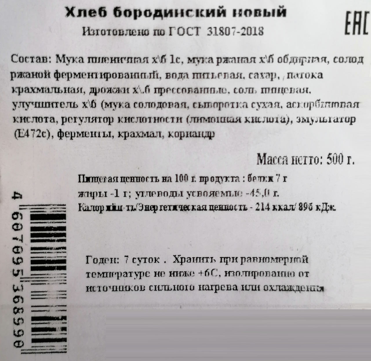 Мука пшеничная х/б 1 сорта, мука ржаная х/б обдирная, солод ржаной ферментированный, вода питьевая, сахар, патока крахмальная, дрожжи х/б прессованные, соль пищевая, улучшитель х/б (мука солодовая, сыворотка сухая, аскорбиновая кислота, регулятор кислотности (лимонная кислота), эмульгатор (Е472с), ферменты, крахмал, кориандр.