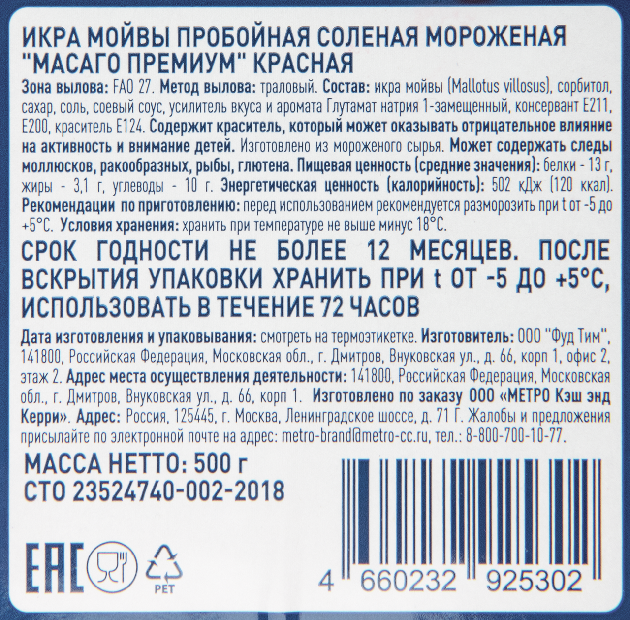Икру масаго используют для украшения суши, роллов, в частности знаменитыхроллов Калифорния. Икра масаго премиум красная METRO Chef изготовлена из икры мойвы без добавления других видов рыбы, поэтому отличается нежностью. Пикантность и вкус добавляют соевый соус, сахар и соль.