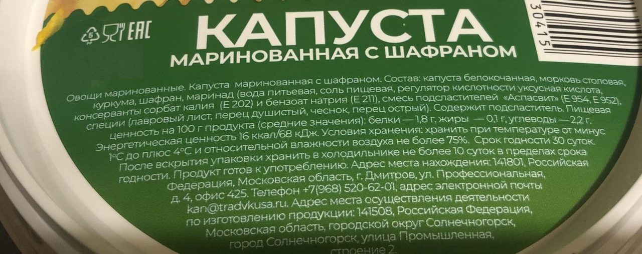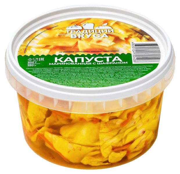 Капуста белокачанная, вода, морковь столовая, сахар, соль пищевая, регулятор кислотности уксусная кислота, шафран.