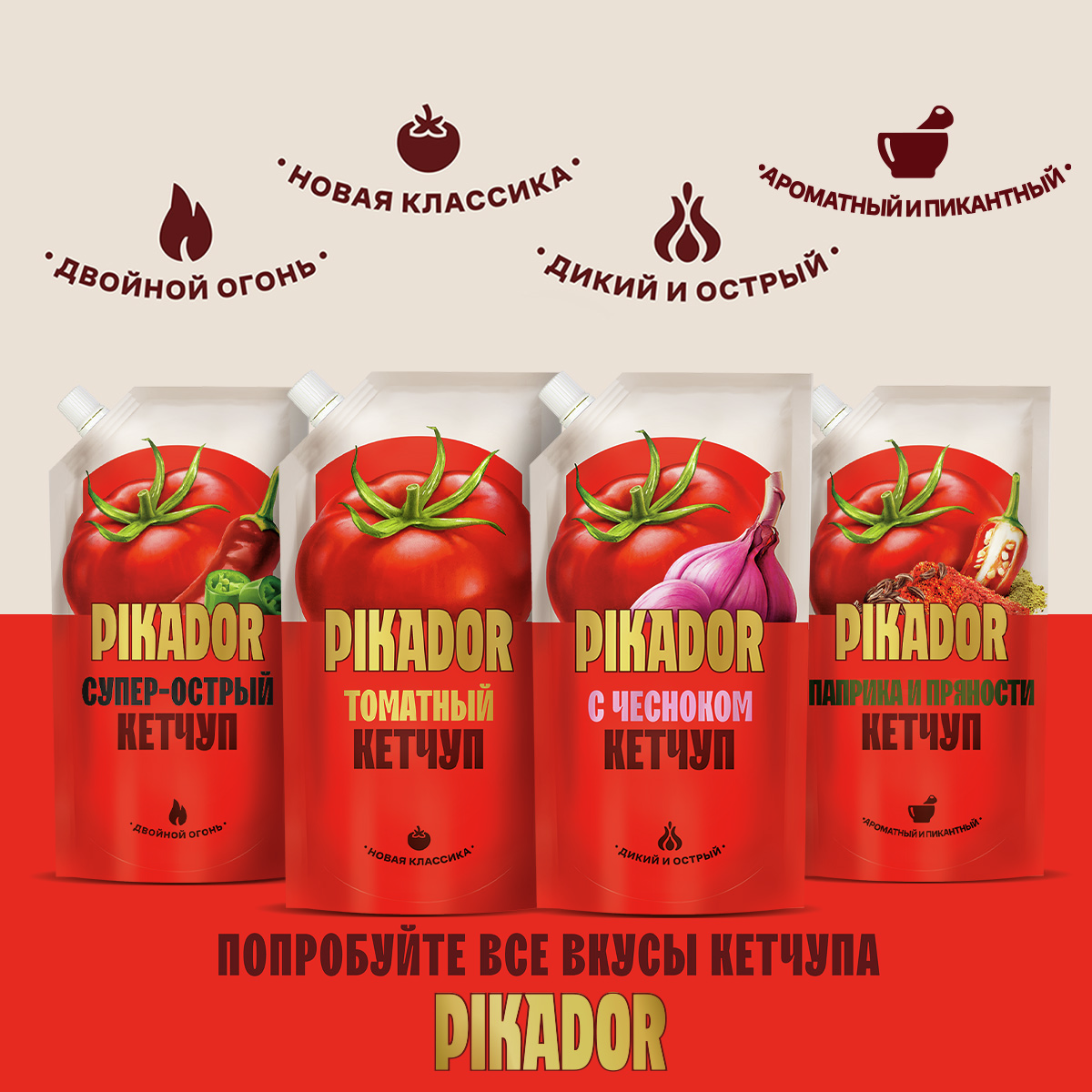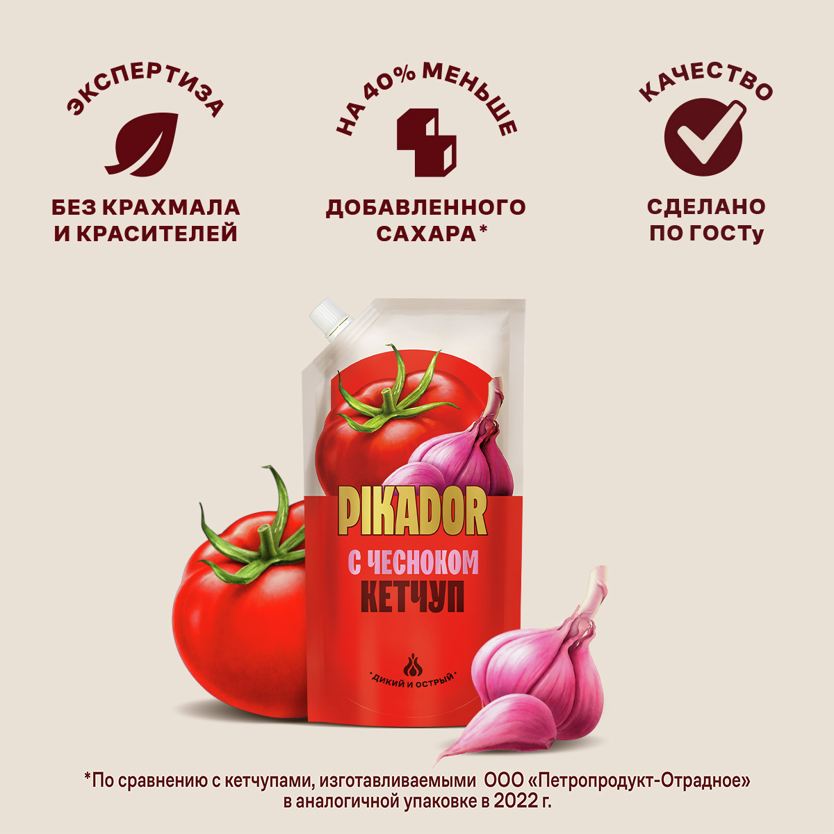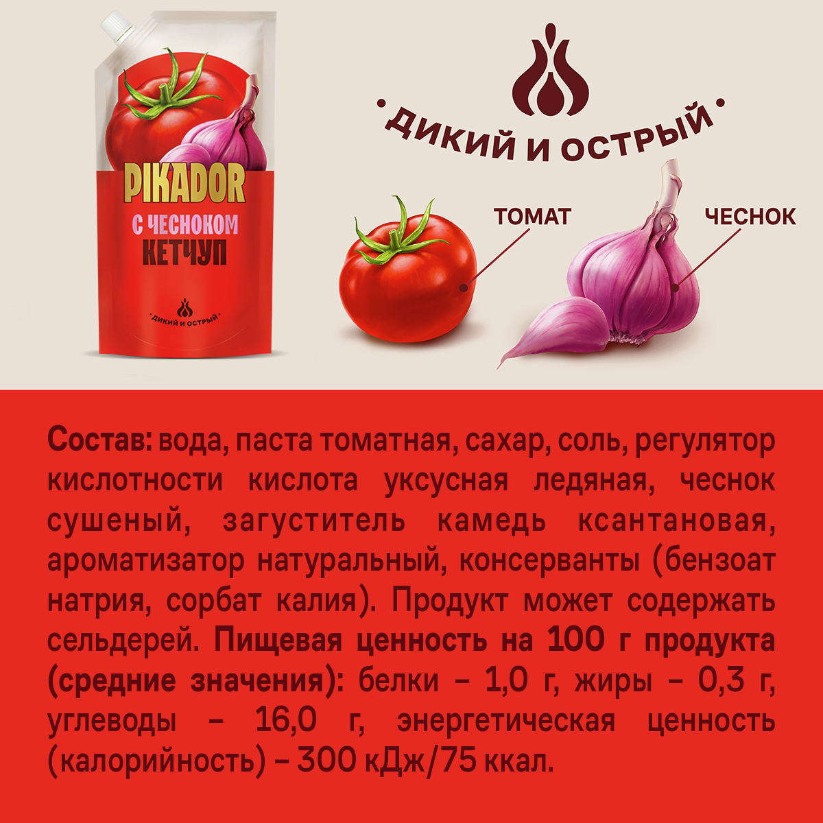Томатный кетчуп Pikador с чесноком приятно удивит новым исполнением классического томатно-чесночного вкуса. Кетчуп с добавлением чеснока придаст яркости и остроты любому блюду. Любители пряного вкуса и аромата чеснока оценят насыщенность и неожиданную пикантность чесночного томатного кетчупа Pikador. Поможет подчеркнуть дегустационные качества привычных блюд, сделать их вкус более ярким и выразительным. Продукт изготовлен на основе томатной пасты с добавлением натурального сушеного чеснока.