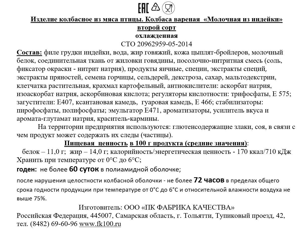 Колбаса Фабрика качества молочная из индейки вареная, 500г