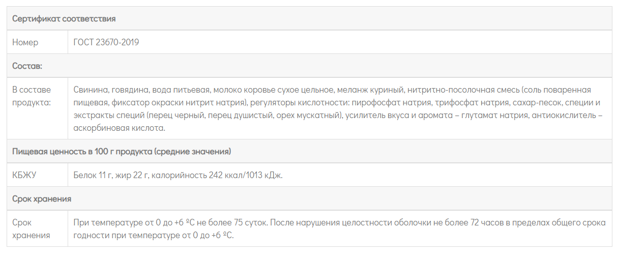 Изготовлена из охлажденной свинины и говядины, молока и свежих яиц. Имеет нежную консистенцию, которая просто тает во рту. В состав входит натуральное молоко, благодаря чему продукт имеет нежный сливочный привкус. Колбаса прекрасно подходит для легкого перекуса. Ее можно добавлять в различные салаты, окрошку, омлеты и другие блюда.
