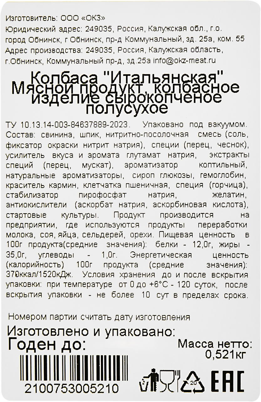 Колбаса Обнинский Итальянская сырокопченая, ~500г